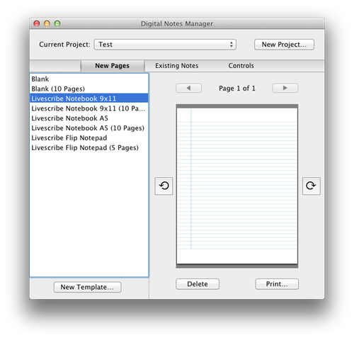 After selecting a template by clicking on its name, you'll see a preview of the template and have the option to print by clicking on the Print… button at the bottom of the window. Note that you will need to select the appropriate dot pattern for the type of pen you plan to use, and the resulting printed page will work only with the selected type of pen (see Anoto vs. Livescribe Printouts below). Every template can be printed with either type of pattern. Also, note that a limited number of pattern pages are available. If no pattern is available for a specific project, either one or more templates have to be removed, or a new empty project has to be defined (every empty project has a new set of patterned pages).