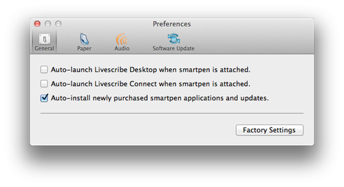 Please note that the Livescribe Desktop software tool (available at http://www.livescribe.com/starthere) must be installed on the computer to be able to set up Ethnographer++ on the Livescribe pens and to retrieve notes stored on the pen. We recommend that you disable automatic opening of Livescribe Desktop and Livescribe Connect when the pen is connected. This can be done by deselecting the appropriate options in the application Preferences under the Livescribe Desktop menu of Livescribe Desktop.