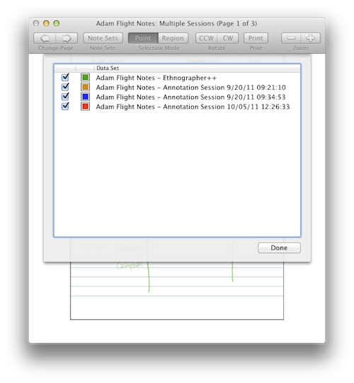Keep in mind that the type of printed pattern needs to match the type of digital pen, and the type of pattern needs to be manually selected when you print. However, once digital notes are loaded in ChronoViz, they can be printed with either pattern. For example, a set of notes taken in the field with a Livescribe pen can be loaded in ChronoViz, then re-printed on Anoto streaming pattern to interactively add additional notes with an Anoto Bluetooth pen.