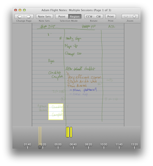 You can also select regions of the notes to visualize when notes in the select region were recorded. Click the Region button in the toolbar that is part of the Selection Mode pair of buttons. This will cause a timeline to appear at the bottom of the notes window. You can drag a rectangular selection box on the notes, and the times of the corresponding notes will apppear on the timeline. Clicking on one of the notes on the timeline will drive the ChronoViz session back at the point when the particular note was taken.